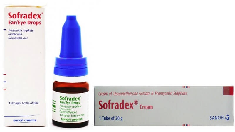 Софрадекс содержит такие действующие вещества, как фрамецетин, дексаметазон и грамицидин С. Благодаря такому составу медикамент оказывает противовоспалительное, антибактериальное и антигистаминное действие на очаг воспаления. Софрадекс обычно назначают при проведении медикаментозной терапии хронического наружного и острого отита. Курс лечения составляет не более 7 дней по 2-3 капли в больное ухо несколько раз в день. Противопоказаниями к лечению таким средством является повреждение барабанной перепонки, туберкулез и инфекции грибкового или вирусного происхождения.
